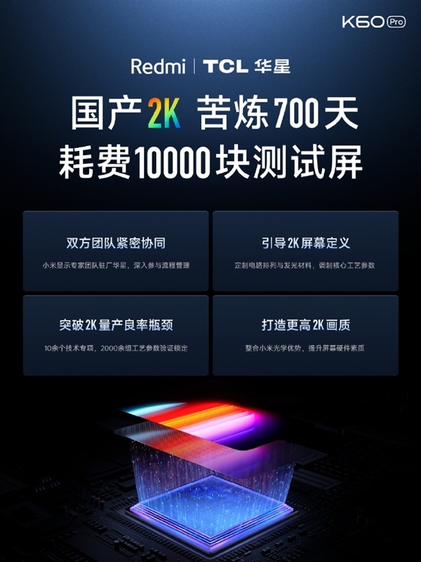 剛剛發布的Redmi K60/K60 Pro搭載了一塊相同的2K解析度國產屏,由小米和華星光電歷時700多天聯合研發。