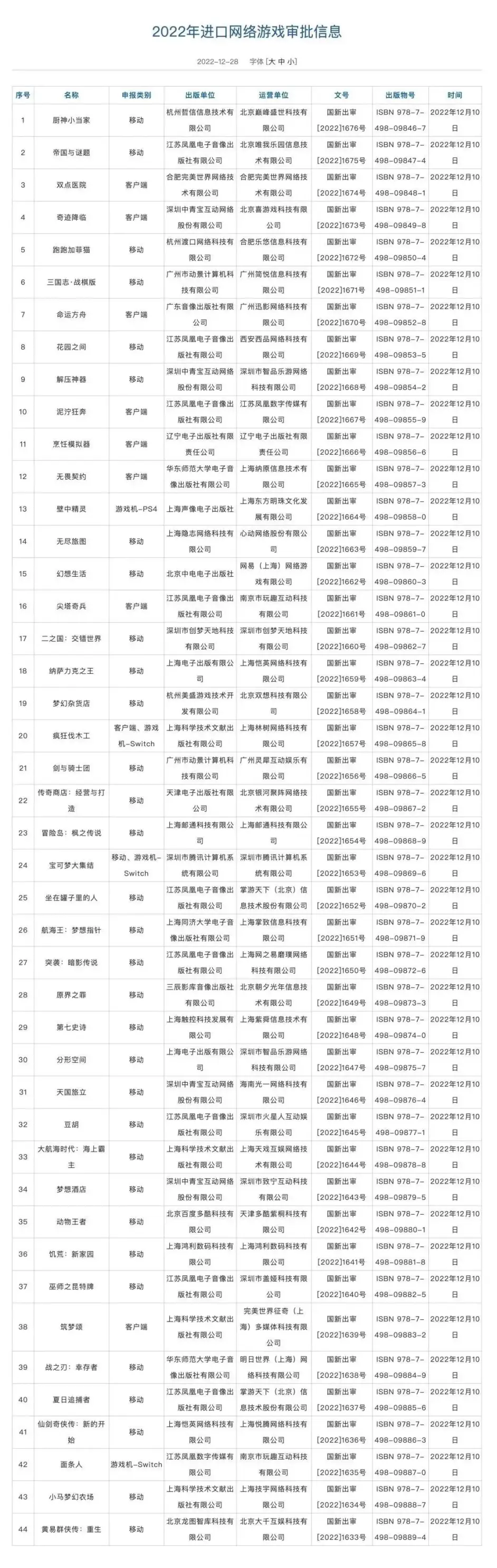 國家新聞出版署公布了2022年12月份國產網路游戲及進口網路游戲審批信息,共有84款國產游戲及44款進口游戲過審,包含其中包含《寶可夢大集結》《雙點醫院》《尖塔奇兵》《二之國 交錯世界》瓦羅蘭特國服《無畏契約》等移動、PC及主機端游戲,詳細名單見圖。