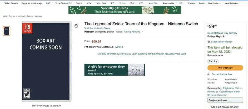 《塞爾達傳說:王國之淚》目前已上架Amazon、BestBuy、Gamestop等海外零售商平台,預訂價59.99美元。游戲預計將於2023年5月12日登陸Switch平台。
