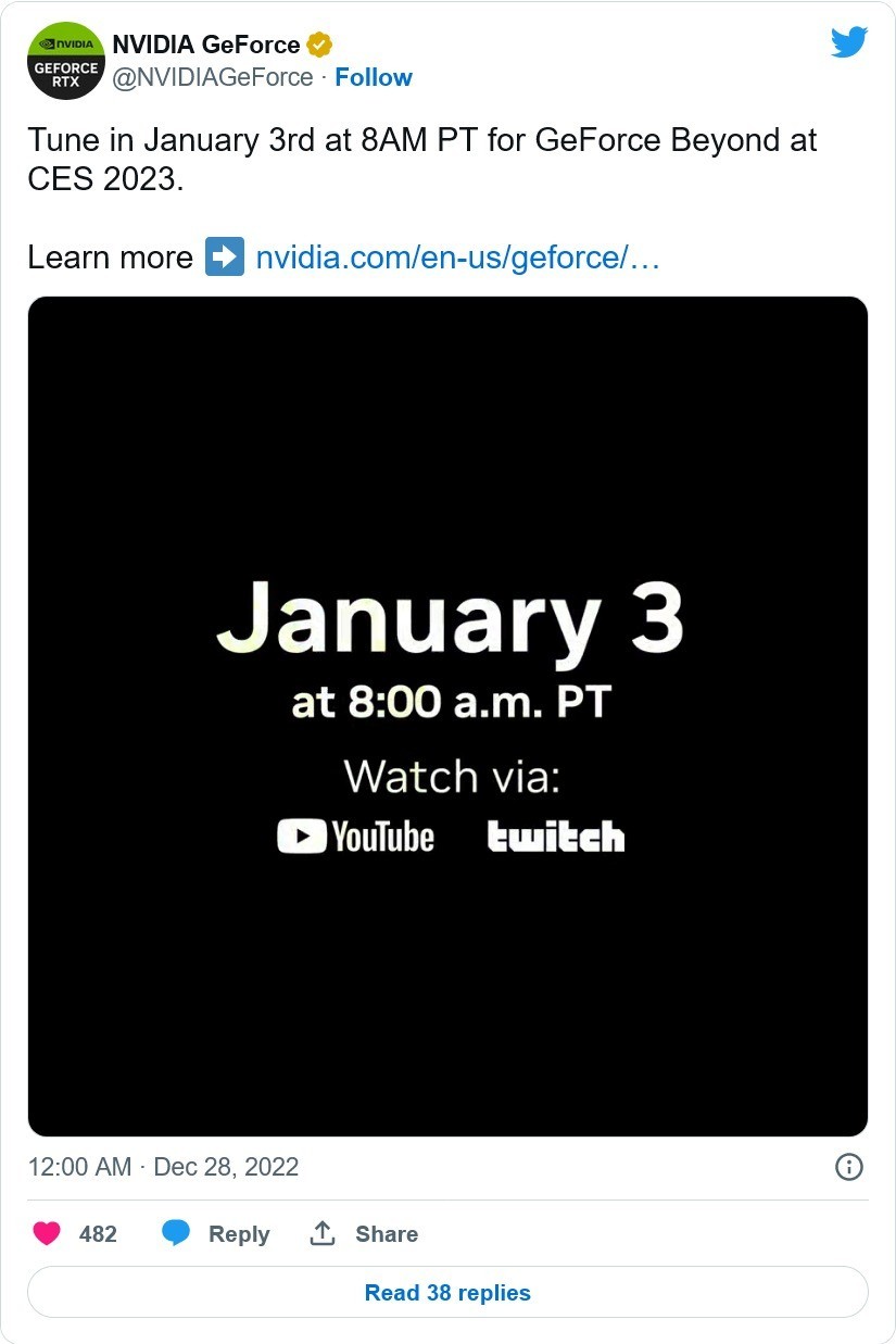 NVIDIA日前證實,公司將在1月3日舉辦名為"GeForce Beyond"的發布會活動。預計會上將展示面向筆記本電腦的GeForce RTX 40系列移動GPU,以及改名後的RTX 4070 Ti。繼數周來關於NVIDIA不斷提供Ada Lovelace架構系列產品新成員的傳言不斷涌現之後,現在最新發布會日期已經塵埃落定,即2023年拉斯維加斯國際消費電子展開幕前幾天。