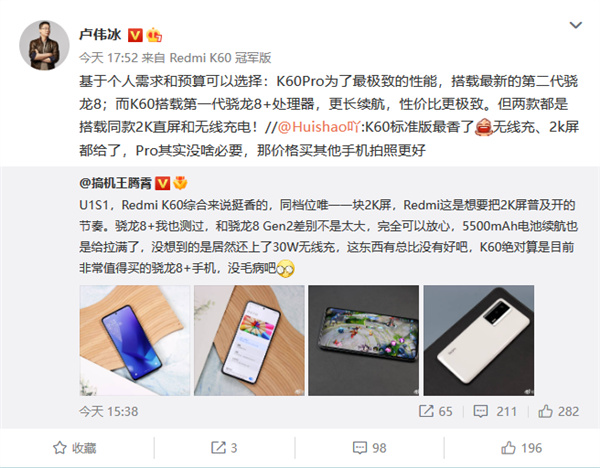 盧偉冰本人今天在微博上給出了自己的建議,他認為應該基於個人需求和預算進行選擇。