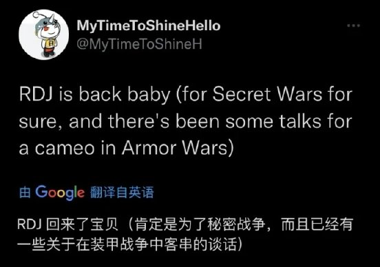 根據知名爆料賬戶 MyTimeToShineH 發推爆料,稱小羅伯特·唐尼已經和漫威達成協議,確認回歸《復仇者聯盟6:秘密戰爭》,再次出演鋼鐵俠!同時大概率在《盔甲戰爭》中客串,但後者目前還在商談,並未最終確認!