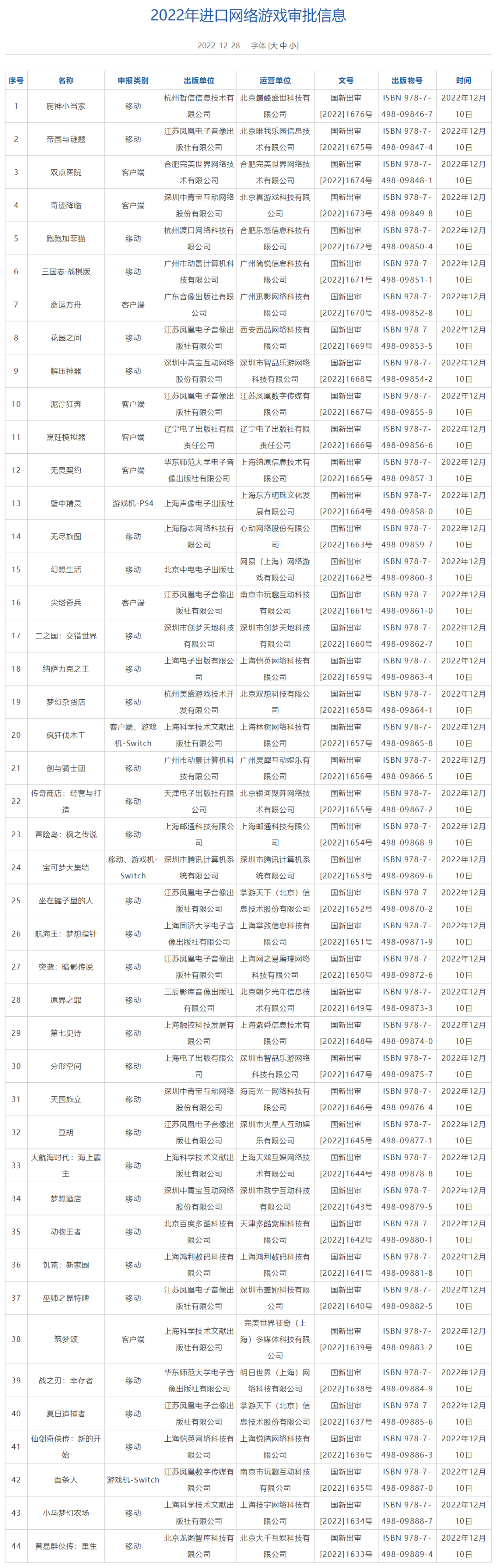 就在大家認為2022年要不溫不火地過去的時候,出版署突然放了個大招:2022年12月一次性過審128款游戲版號,其中包括84款國產游戲和44款進口游戲。