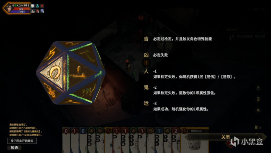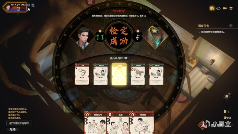 也就是說,玩家需要在每回合的調查開始之前,通過投擲點數來避免受到強制負面事件的影響。而當不可避免的負面事件的觸發達到一定次數時玩家仍未達成目標,遊戲就會直接判定失敗。