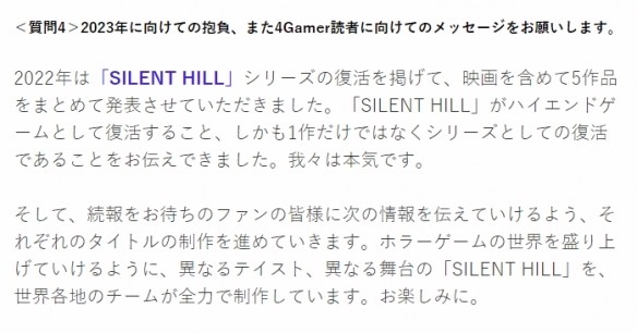 「為了早日給期待該系列的粉絲帶來更多情報,我們正在積極推進每個項目的開發。世界各地的團隊都在努力製作不同風格、不同階段的《寂靜嶺》,讓恐怖遊戲世界為之興奮和期待。」