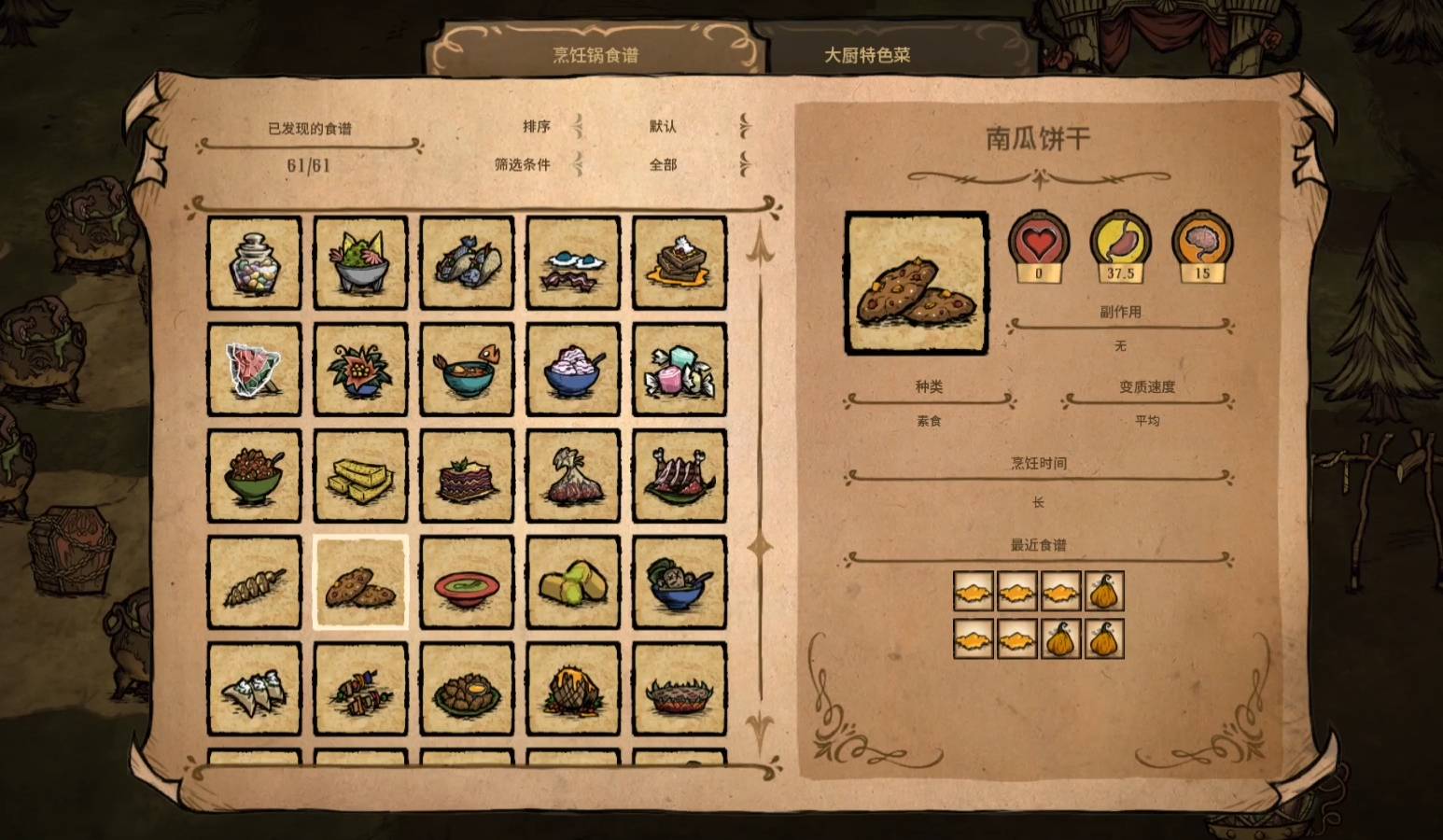 優點:南瓜曲奇可以恢復37.5飽食度和15點理智值。是遊戲中少有的可以一次恢復10點以上理智值且沒有負面效果的料理。