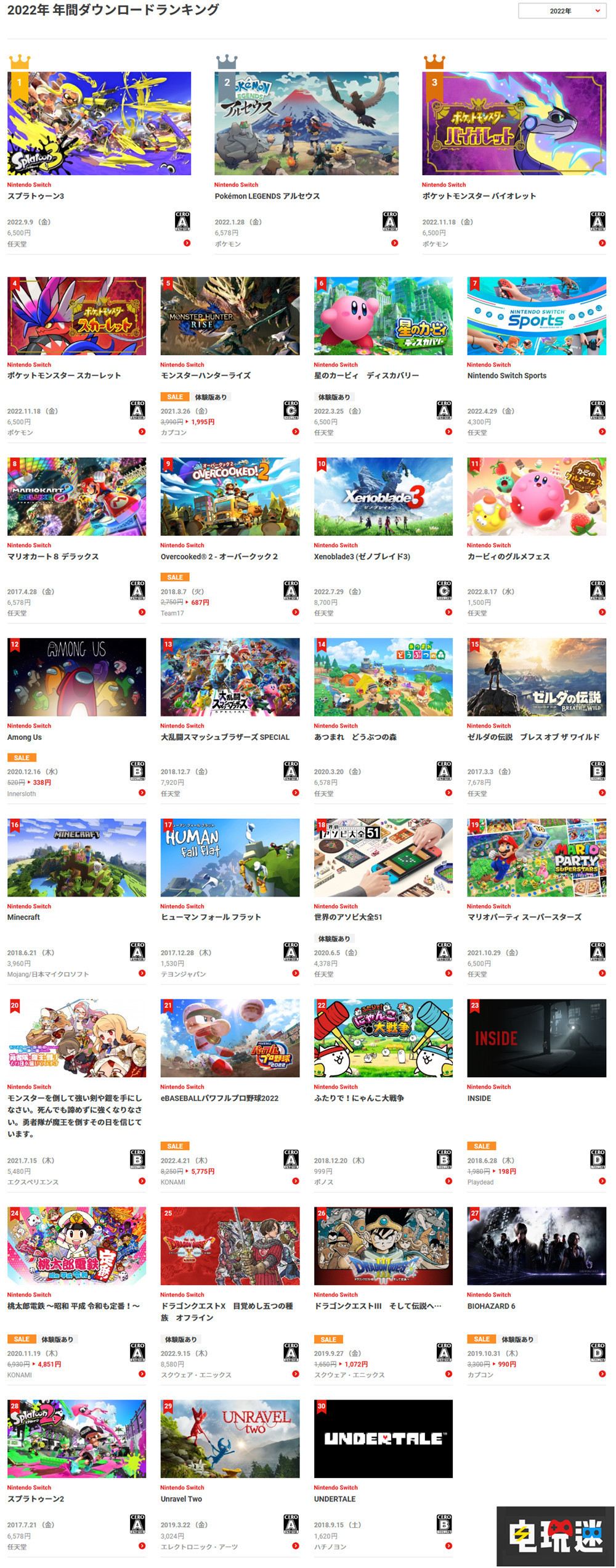日本任天堂今天公開了2022年eShop日服的數字版游戲銷量排行榜,榜單自然還是任天堂自家游戲的主舞台。今年的第一名《斯普拉遁3》,時髦的章魚與烏賊深得人心。寶可夢前五佔三,年初的《寶可夢 阿爾宙斯》,年末的《寶可夢 紫》、《寶可夢 朱》分別位列第二、三、四名。前五名中唯一的第三方是去年第一,今年第五名的卡普空招牌共斗游戲《怪物獵人 崛起》。粉色惡魔《星之卡比 探索發現》位列第六,卡比游戲中最好賣的一作實至名歸。同時任天堂的常青樹《馬里奧賽車8豪華版》也強勢保持前十,位列第八名。作為前十唯二的第三方游戲,「合家歡」的《分手廚房2》位列第九。任天堂第一方JRPG《異度神劍3》位列第十名。
