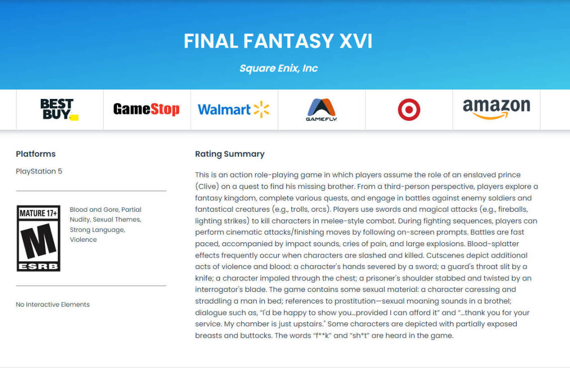 《最終幻想16》現已通過美國ESRB審核評級,本作評級為「M(17+)」,包含血腥暴力、部分裸露、色情主題、粗俗語言等元素