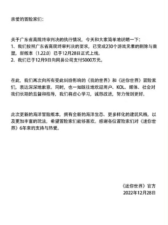今天,《迷你世界》官方再次發布公告回應侵權一事,表示已經向網易支付5000萬元賠償金,並在今天上線的1.22.0版本中,刪除了涉及侵權的230個遊戲元素。