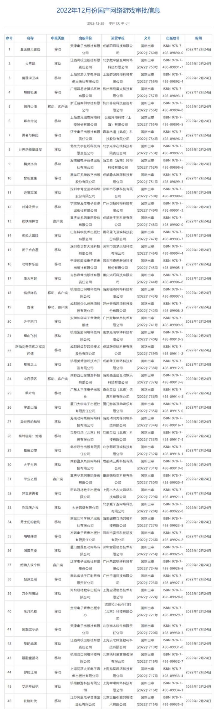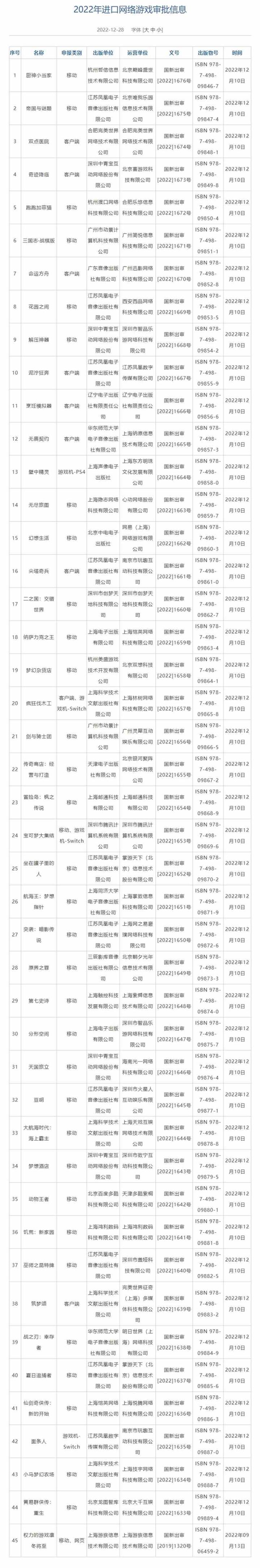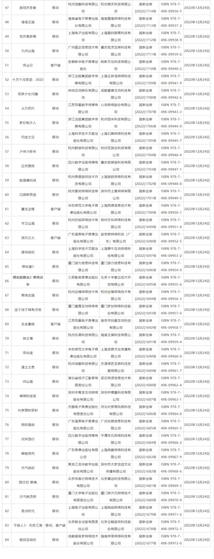 國家新聞出版署今日發布12月國產網路遊戲審批信息(84款獲批)和2022年進口網路遊戲審批信息(44款獲批)。繼9月發放73款,11月發放70款後,本月的84款為今年的國產網路遊戲審批最高值。。其中,網易旗下的《巔峰極速》、心動網路旗下的《火力蘇打》,以及《不良人3:無雙江湖》等重點產品均在其列,合計84款國產遊戲,獲批數量為年內之最。