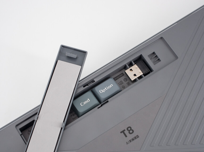 無線接收器和可替換鍵帽在鍵盤背面,這把鍵盤可以自動識別Win或MAC系統,所以沒有一般鍵盤上的物理切換開關。