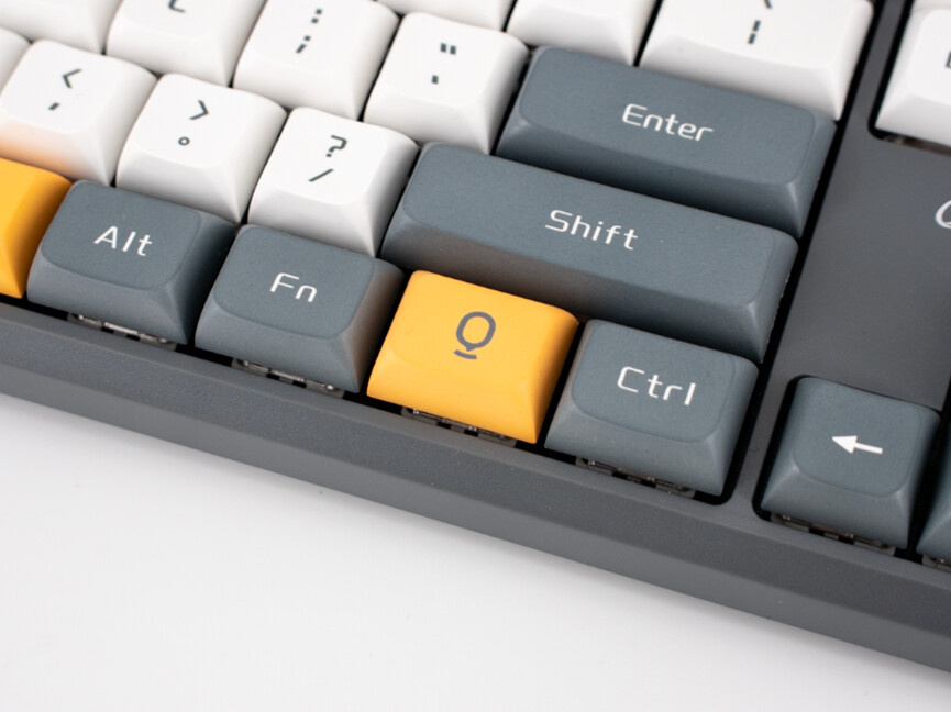 整體採用了灰白配色,加上橙色作為主題色點綴。一般五面熱升華工藝的鍵帽通常會搭配細膩的鍵帽印花,但這把鍵盤的鍵帽設計偏冷淡一些。