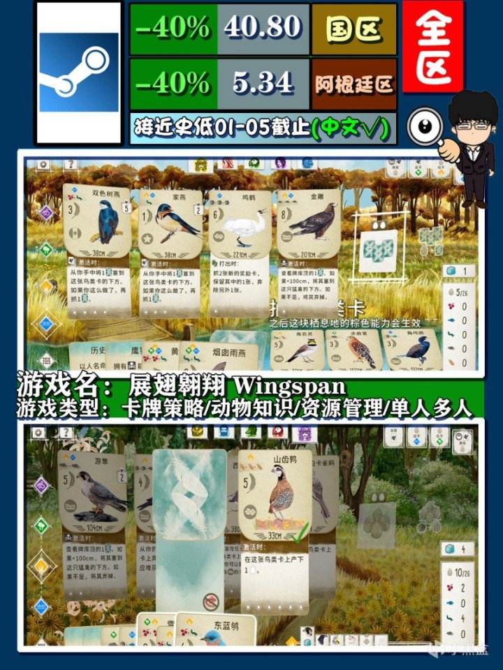 遊戲非常適合平時不接觸卡牌遊戲的新人玩家購買,畫風,音樂,還有中文配音讓玩卡牌的同時能夠很好的享受大自然的動態,鳥類知識的科普是玩完這款遊戲後的最大收穫,另外遊戲上手非常簡單,哪怕從不玩遊戲的純萌新都非常適合