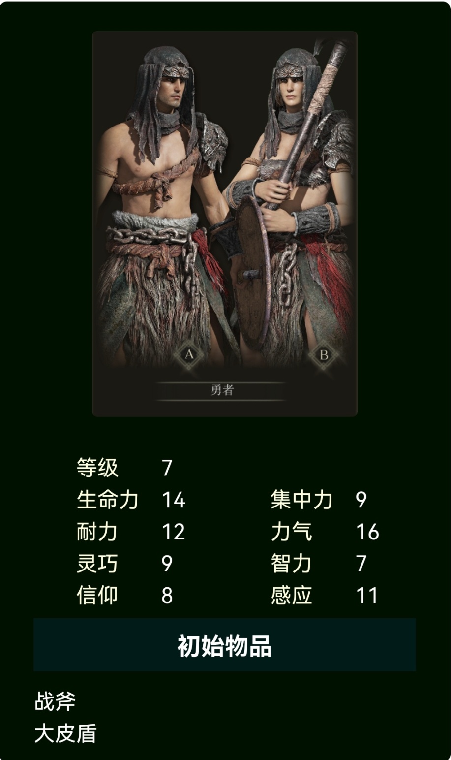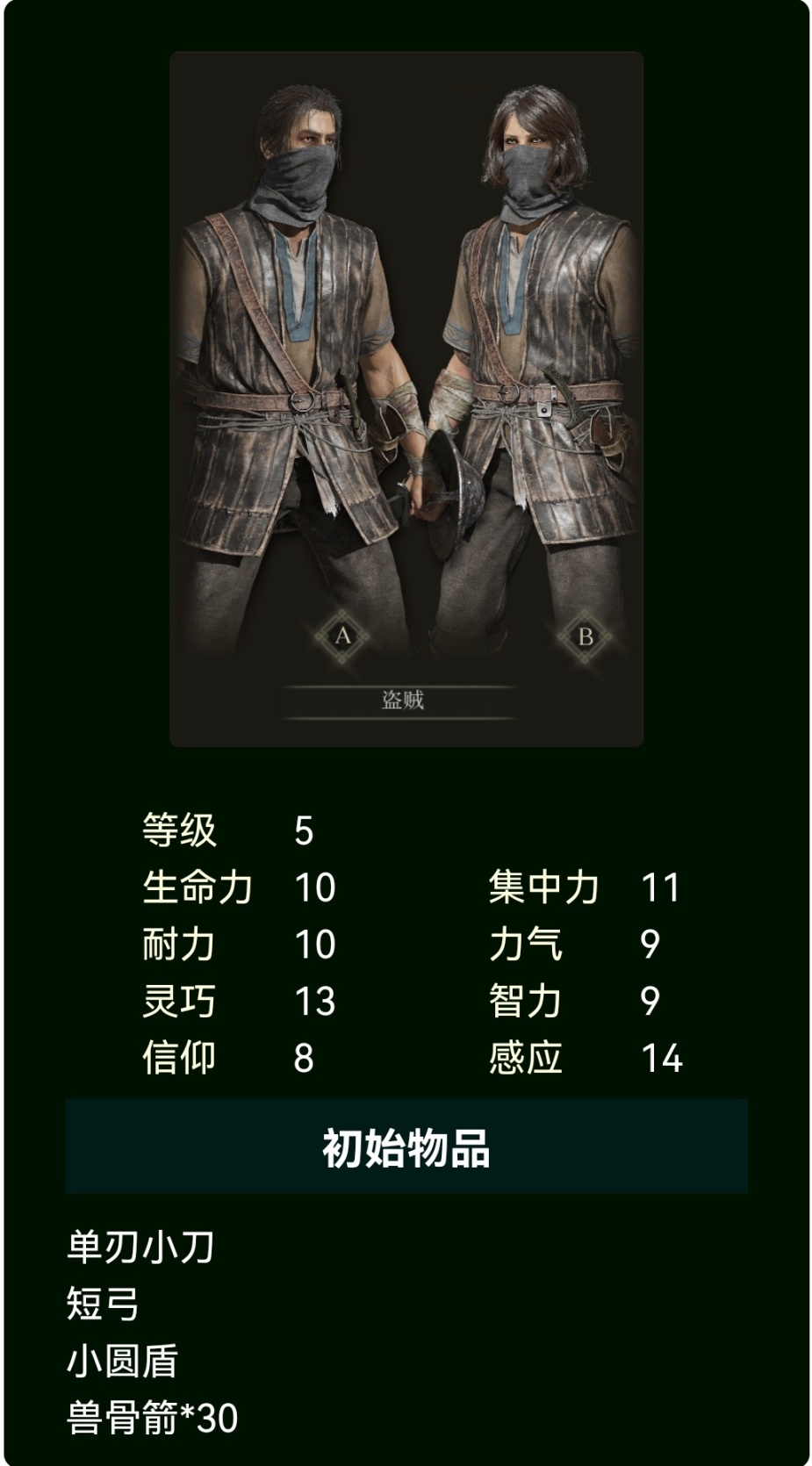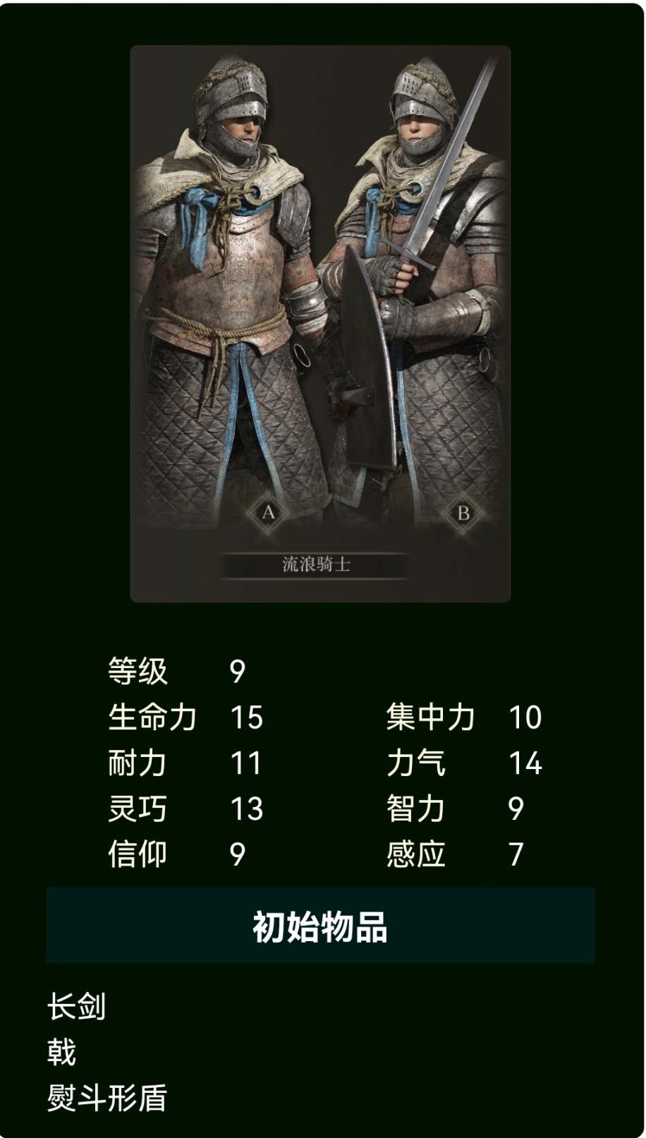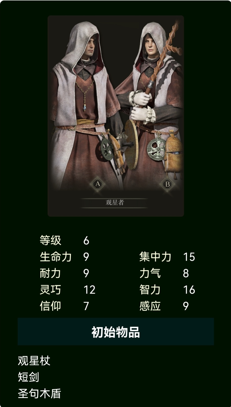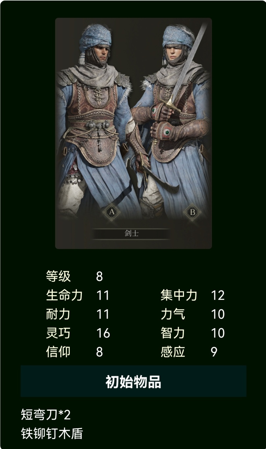 進入老頭環世界的第一件事情就是創建角色並選擇。每個職業主要的不同就在於出生屬性和出生攜帶武器,不同的職業對於遊戲前中期的發展影響極大,下面就對職業進行一一介紹。