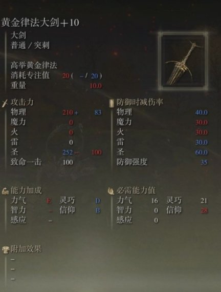 以上圖武器為例,首先是必須能力值:指的是使用這把武器角色所必須具有的屬性,若達不到,則該武器的攻擊力將會被削弱,如圖紅色所示(如果是武器,那麼是削弱攻擊力,如果是魔法或者禱告必須能力值無法滿足,則將無法學習)武器的攻擊力由兩部分組成:基礎屬性和能力加成屬性,基礎屬性由武器本身的等級決定,可以通過強化武器提升,而能力加成屬性則由能力加成決定,某個屬性的能力加成等級越高,則該角色的這一項屬性能為這把武器增加的攻擊力就越多(如圖攻擊力一欄中藍色加成)