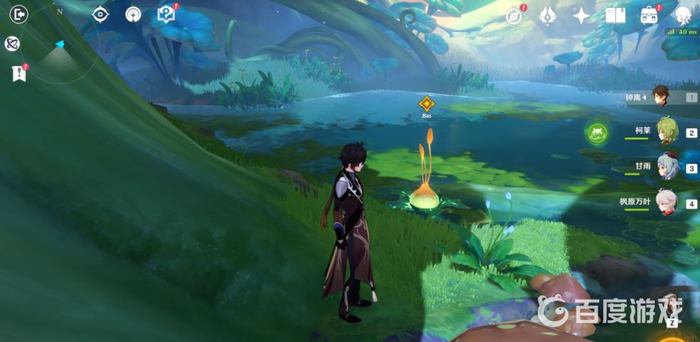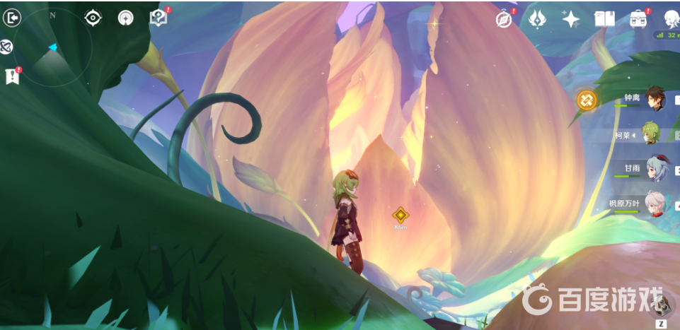 進入秘境後向前走即可碰見「眾葉覺蕊」,當它接觸到草元素之後,能向特定位置散布「四葉印」。這里的四葉印會往空中散布,便於我們順著四葉印進入花中。
