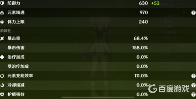 畢業面板要求:1000元素精通、30% 暴擊率、160% 暴擊傷害。(PS:實戰中算上固有天賦的24%暴擊率,就有54% 的暴擊率了。)
