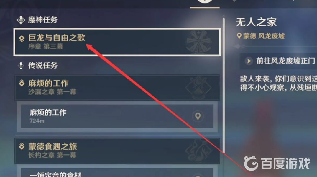 與風魔龍戰斗時,如果自身練度不高,建議用官方給的溫迪試用,利用e技能與普通攻擊即可迅速破掉護盾,之後站在地方射擊風魔龍頸部的污血凝塊即可,兩波即可結束戰斗。