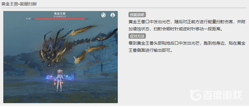 第三個是能量掃射。boss口中會射出光芒並附加侵蝕,掃射的光芒會移動一段距離。玩家可以跑到boss側面躲避後進行輸出。