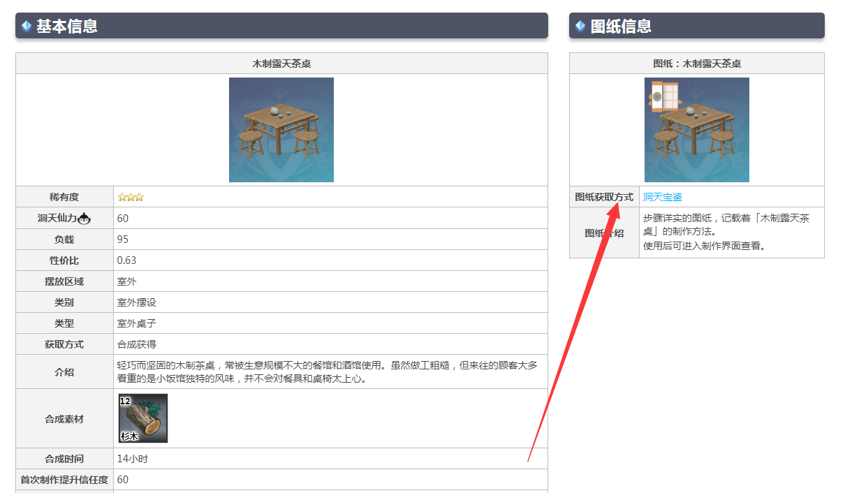 原神的木製露天茶桌圖紙在洞天寶鑒獲得。木製露天茶桌是稀有度為三星的室外擺設,圖紙獲取方式是洞天寶鑒。