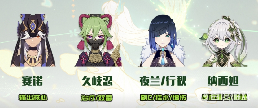 搭配一:賽諾 九歧忍 夜蘭(行秋) 納西妲。以賽諾為主的激化體系,納西妲的長時間掛草彌補了賽諾輸出機制上的缺陷,同時夜蘭的掛水增傷和九歧忍的輔助能力,都讓隊伍輸出持續能力增強。
