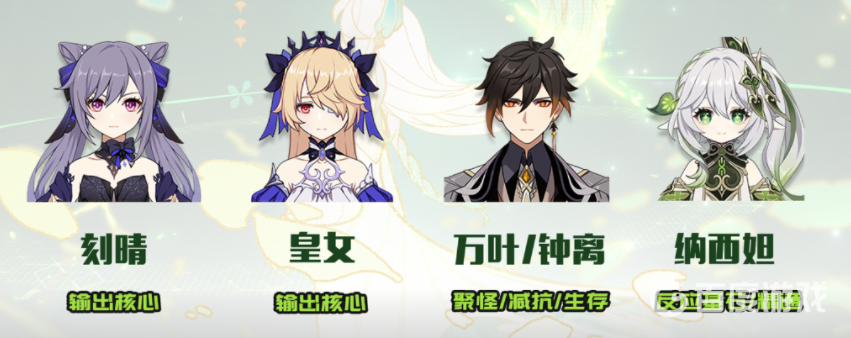 陣容三:刻晴 皇女 鍾離 納西妲。此陣容以刻晴輸出為主,納西妲掛草打出元素反應。同時鐘離的護盾也能為團隊的輸出環境提供有力的保障。