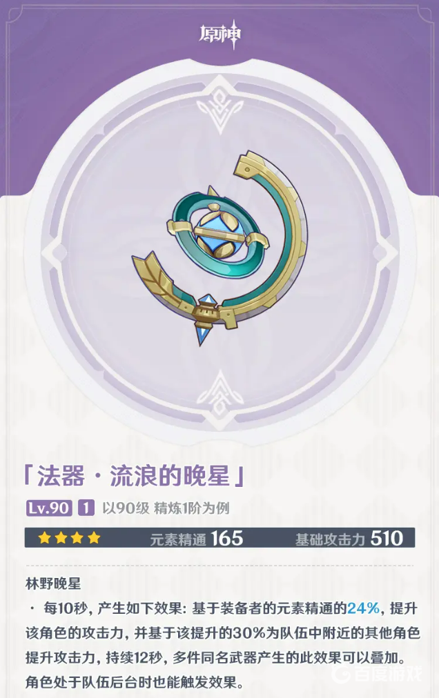 該武器只能通過祈願獲得。林野晚星:每10秒產生如下效果:基於裝備者的元素精通的24%,提升該角色的攻擊力,並基於該提升的30%為隊伍中附近的其他角色提升攻擊力,持續12秒,多件同名武器產生的此效果可以疊加。角色處於隊伍後台時也能觸發效果。