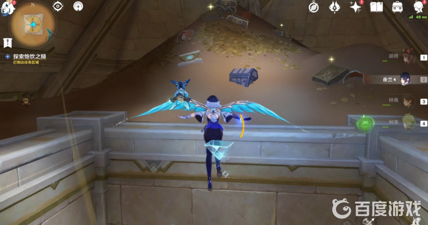 機關開啟後回到門口,利用立柱前的風場飛上去,能看見一個寶箱,打開後獲得任務物品,飽飲之陵探索完成。