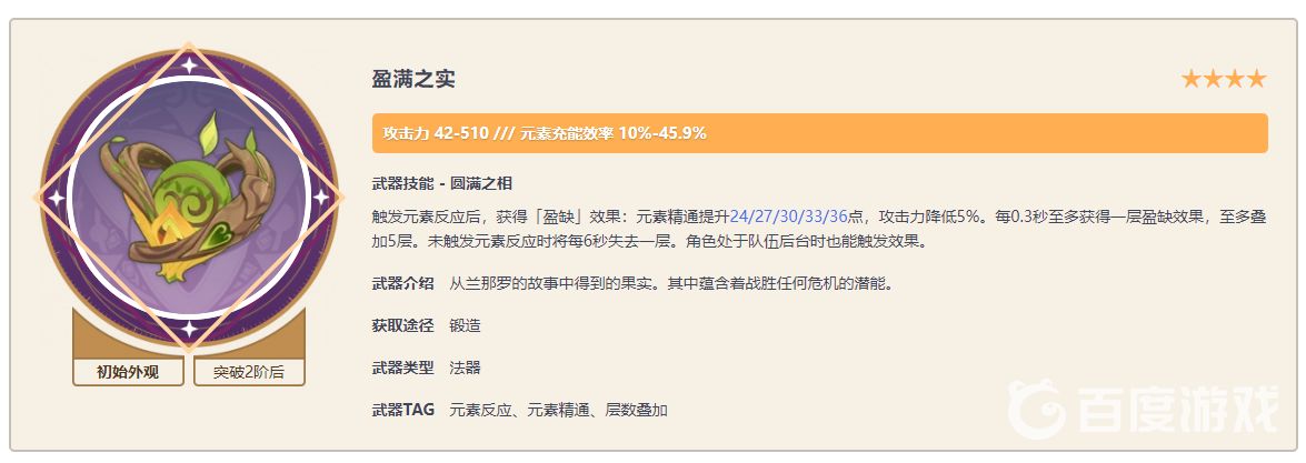 可以鍛造「盈滿之實」。在遊戲中,央陸法器原胚可以生產四星法器盈滿之實,這把武器主詞條是攻擊力加成,副詞條是充能效率的加成,武器效果還可以提升元素精通,也是一把比較好的法器。
