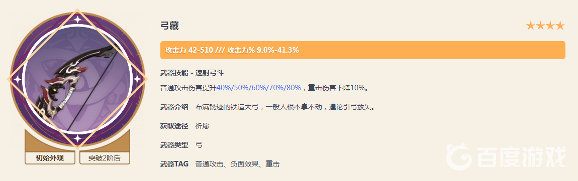 弓藏是普攻流輸出武器,給宵宮等普通攻擊輸出角色佩戴可以帶來極高的傷害加成,甚至逼近很多五星弓箭武器。