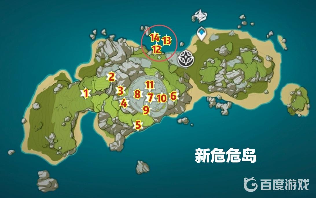 3、新危危島有14個星光凝核(位置如下),其中12~14在舊危危島也能獲得