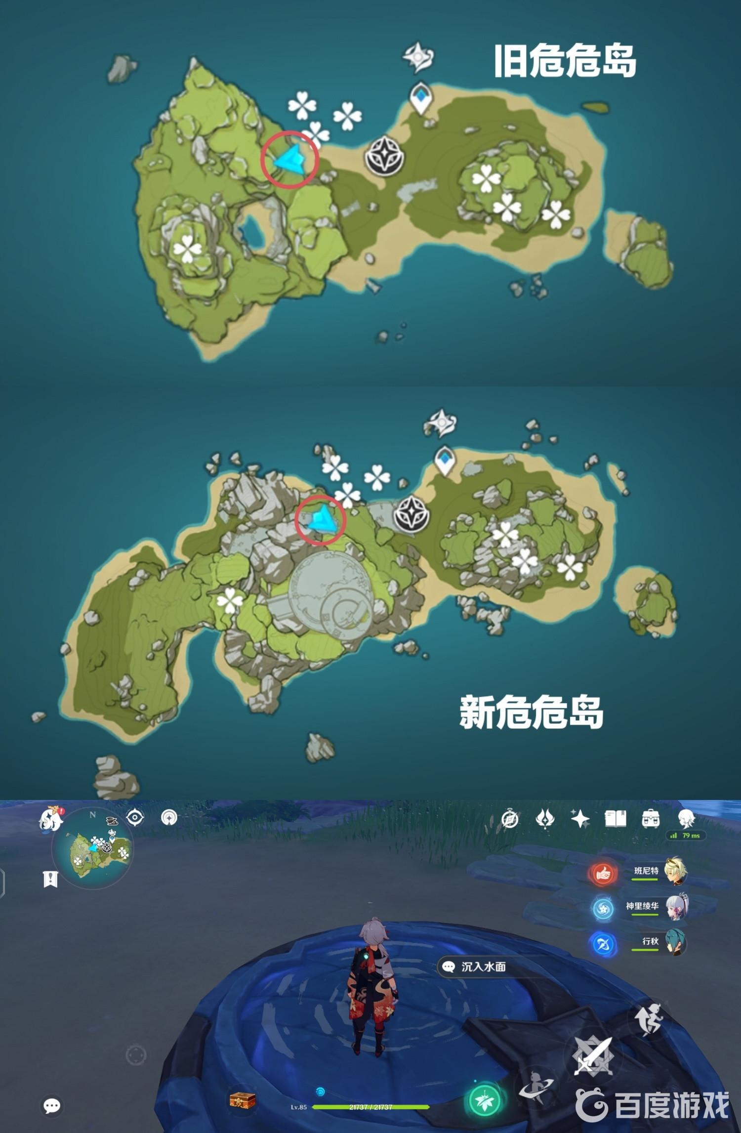 1、首先分別在新/舊危危島圖示紅圈處有一個星盤,通過星盤沉入水面,可以在新/舊危危島之間轉換