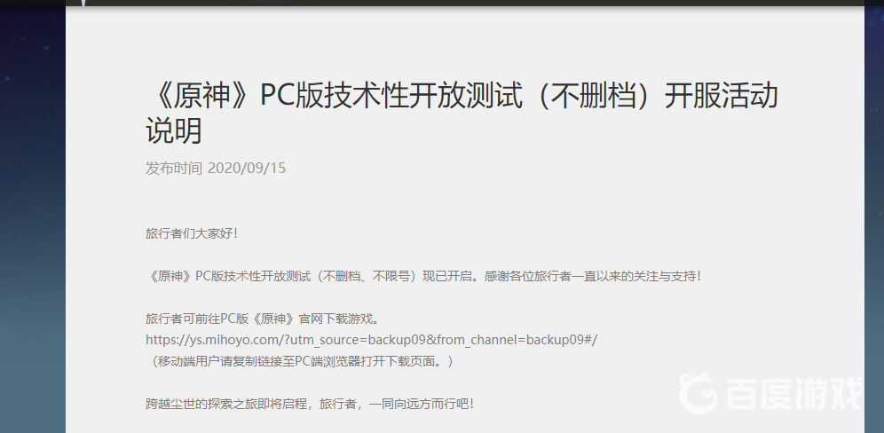 原神的PC端是2020年9月15日上線,當時叫「技術性不刪檔測試」,那時候角色卡池只有基礎池。而原神全平台(PS4、IOS、Andriod、PC)上線的的時間是2020年9月28日,名為「全球同步公測」,並且在這一天也開放了1.0版本的UP卡池。