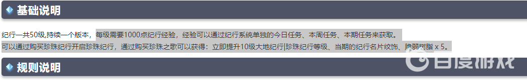 紀行一共50級,持續一個版本,一個版本大約是45天左右。每級需要1000點紀行經驗,可以通過購買珍珠紀行開啟珍珠紀行,通過購買珍珠之歌可以獲得:立即提升10級大地紀行|珍珠紀行等級、紀行名片紋飾、脆弱樹脂 x 5。