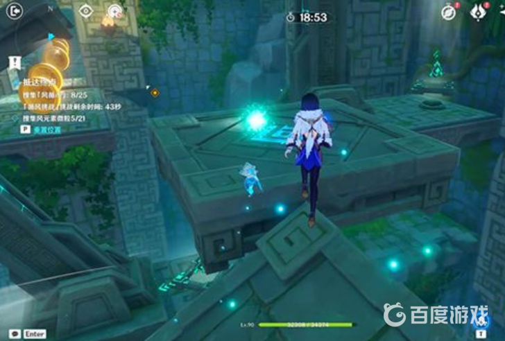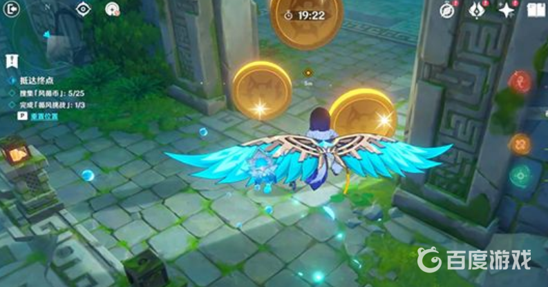 2、進入秘境後跟著金幣來到第一個挑戰處,第一處比較簡單,利用控風樞開啟和關閉風場可以使平台上升下降,以完成第一次挑戰(這里不用改變風場方向);