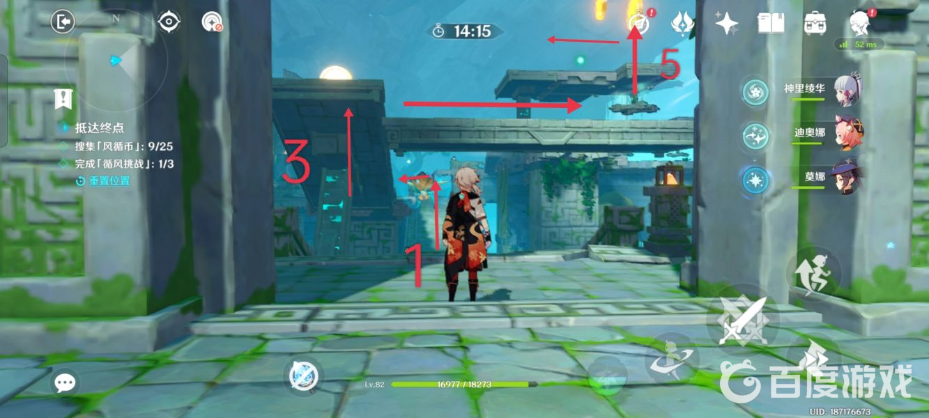 消滅怪物後,原路返回,將台階下方左側的風場改為吹向迎風台,使平台傾斜。回到台階上,按紅色箭頭方向前進,在5處將風場改為朝上。
