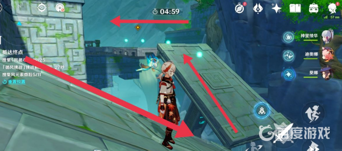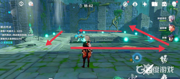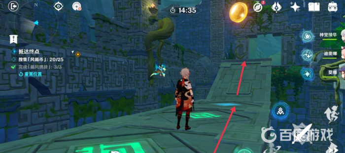 6.首先點擊控風按鈕,關閉所有風場。向前行走,來到此處並下落到前方平台。到達平台後,點擊控風按鈕,開啟風場,平台上升。如圖箭頭所示所示回頭拿風循幣。繼續向任務點前進。