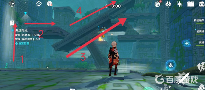 2.來到第二個房間,仍然首先點擊控風按鈕,關閉所有風場。依次將圖中將1處風向向左、將2處風向向上並開啟、乘坐2處風場來到3處將風向向左、回頭將2處風向向左。原路返回,點擊控風按鈕,開啟所有風場,按照如圖箭頭順序,收集並完成挑戰。