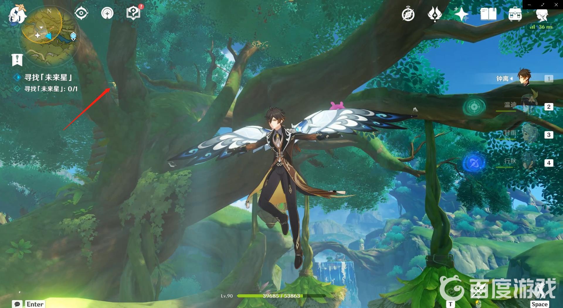 6、降落在樹幹上後看向北方向,可以看到空中有一顆未來星,這就是第六關所需拿到的未來星。