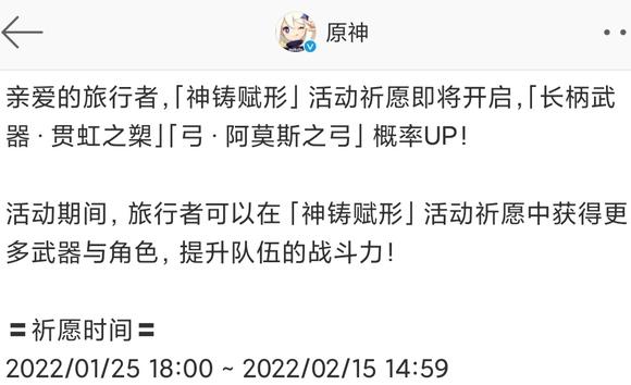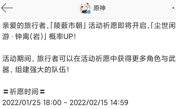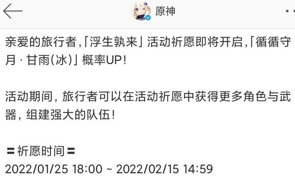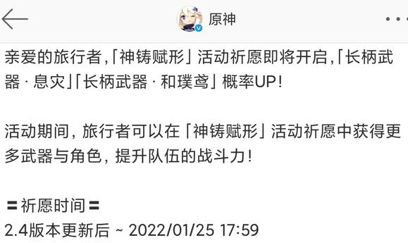 原神2.4版本卡池更新的具體時間分為兩段,根據官方公布的來看,第一期是2022年1月5日(版本更新後 ),第二期是2022年1月25日。2.4版本上半場的角色卡池UP池為申鶴池、魈池;下半場的角色卡池UP池為甘雨池、鍾離池。