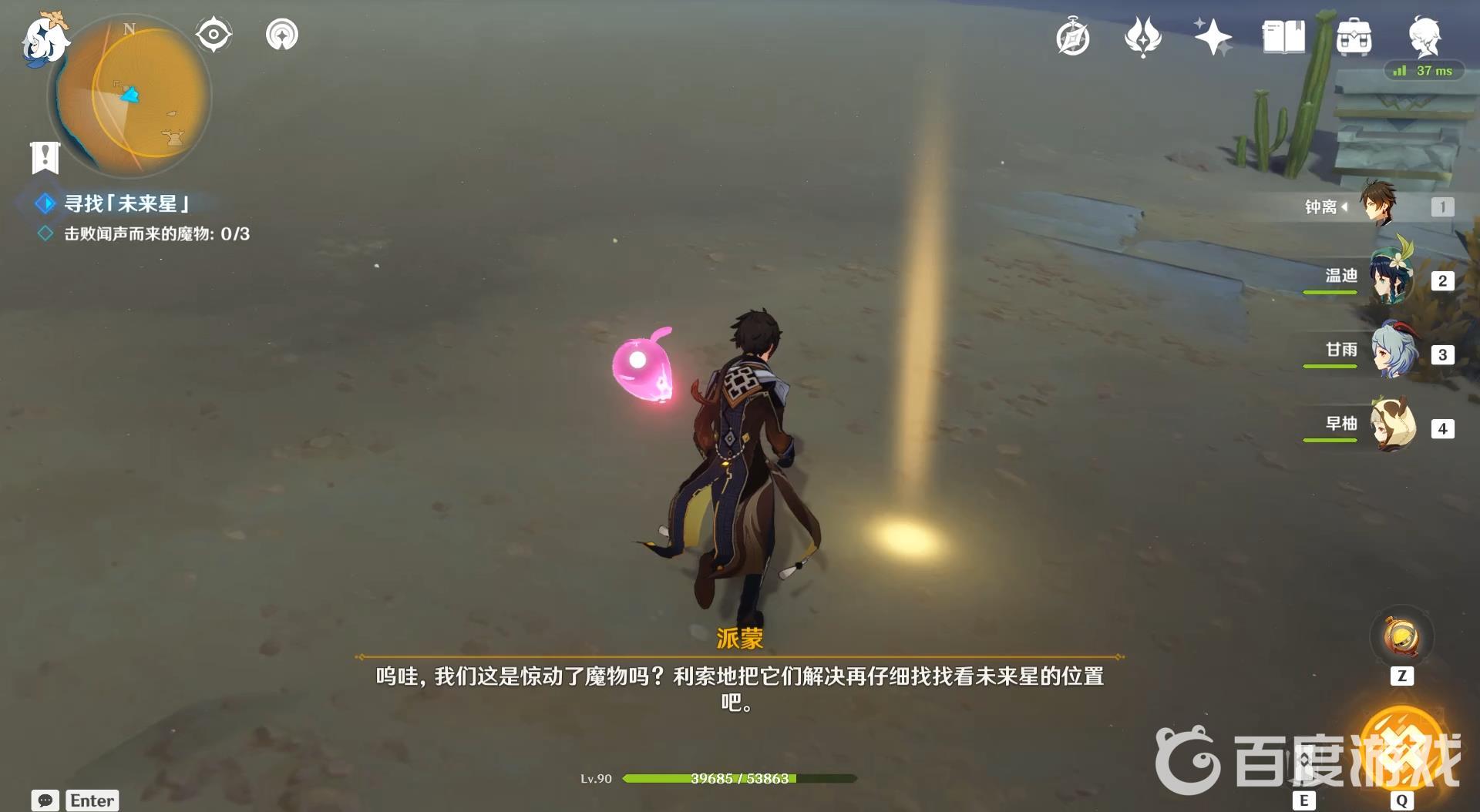 3、直到屏幕上出現尋找未來星的提示時停止前進,這時看向西南方向,可以看到有一個火元素方碑,去到火元素方碑旁。