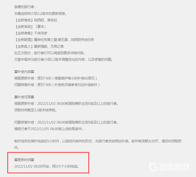原神3.2版本是2022/11/02 06:00開始更新,更新時間為五個小時。在更新期間,玩家是無法登陸遊戲的,不過更新完成後,會共計補償600原石。