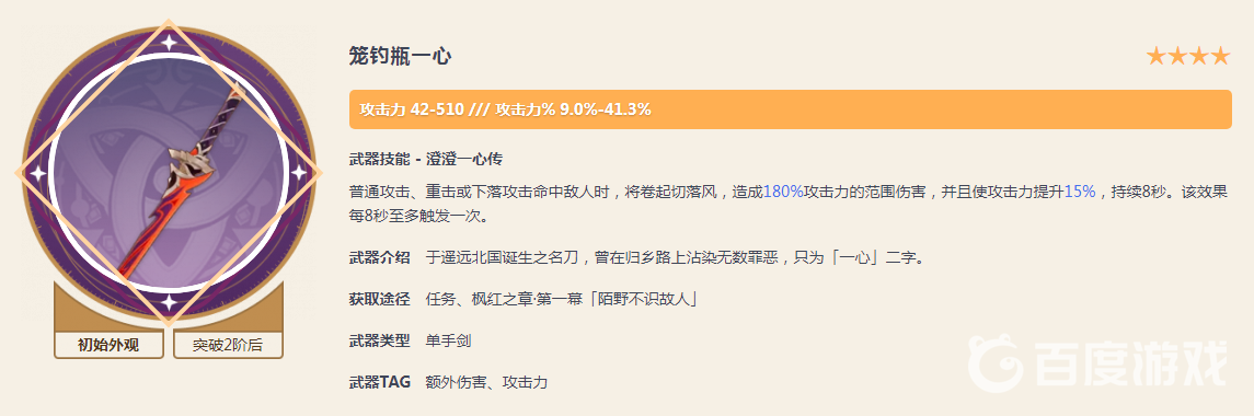 籠釣瓶一心武器外觀和武器特效觸發時產生的楓葉旋風視覺效果完美適配楓原萬葉。可惜副屬性為攻擊力的它僅適合以站場輸出定位進行聖遺物配裝(攻擊力百分比、風元素傷害加成、暴擊率/暴擊傷害)的楓原萬葉使用。