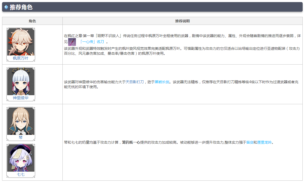 該武器對神里綾華的傷害輸出能力大於天目影打刀,遜於黑岩長劍。該武器無法精煉,僅推薦在天目影打刀精煉等級4級以下時作為過渡武器或者充能無憂的環境下使用。