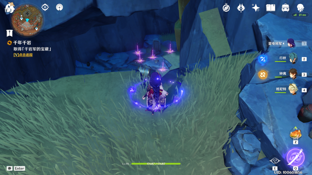 取得6個供物後返回紀念石的位置開啟寶藏,其中有一個華麗的寶箱以及四星千岩牢固系列聖遺物若干