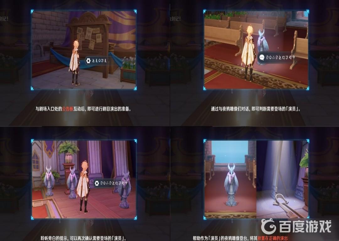 3、當旁白說到「就在這時,惡龍忽然登場」時,我們身旁會出現一個夜鴉雕像,他就是演員「惡龍」,選擇協助演員登台(之後,夜鴉雕像會變成羽毛附著在我們身上,我們來到舞檯燈光照射的地方,選擇確認演員站位)。