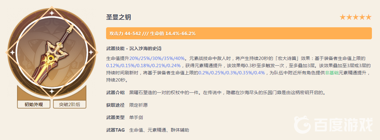 原神板磚指的是聖顯之鑰,它是稀有度為五星的單手劍,可以通過限定祈願獲得。聖顯之鑰介紹:黑曜石塑造的一對的權杖中的一件。在傳說中,隱藏在沙海盡頭的樂園門扉是由這柄密鑰開啟的。