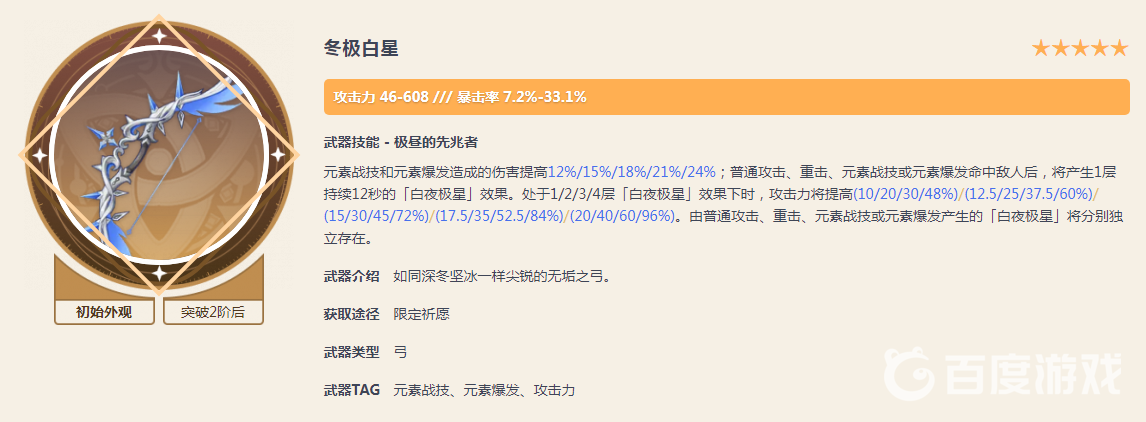 暴擊率副屬性的五星武器,降低面板成型難度。二者相比,天空之翼是純面板武器,外觀和背景故事都與溫迪十分契合;而冬極白星的輸出上限更高,但前提是通過一定的手法來疊被動;由於溫迪的元素爆發擁有快照機制(即俗稱的「鎖面板」),需要注意在釋放元素爆發之前先疊好冬極白星的被動。