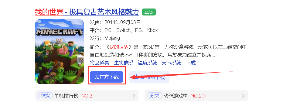 首頁 我的世界 問答 我的世界基岩版在哪下? 2022-12-30 【我的世界】基岩版的下載方式如下:1、在搜索引擎搜索我的世界,點擊去官方下載進入頁面:2、在該界面完成購買,即可下載基岩版我的世界:以上就是有關於我的世界基岩版下載的介紹。