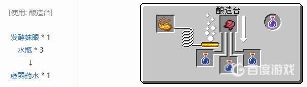 首頁 我的世界 問答 我的世界虛弱藥水怎麼釀造? 2022-12-30 1,首先我們需要找到釀造台,點擊滑鼠右鍵進入釀造台。2,然後按照如圖所示在上面放上發酵蛛眼,下面放三個水瓶,就可以合成虛弱藥水了。
